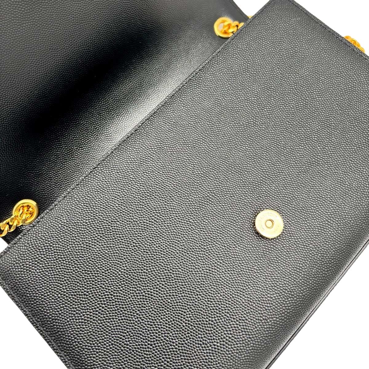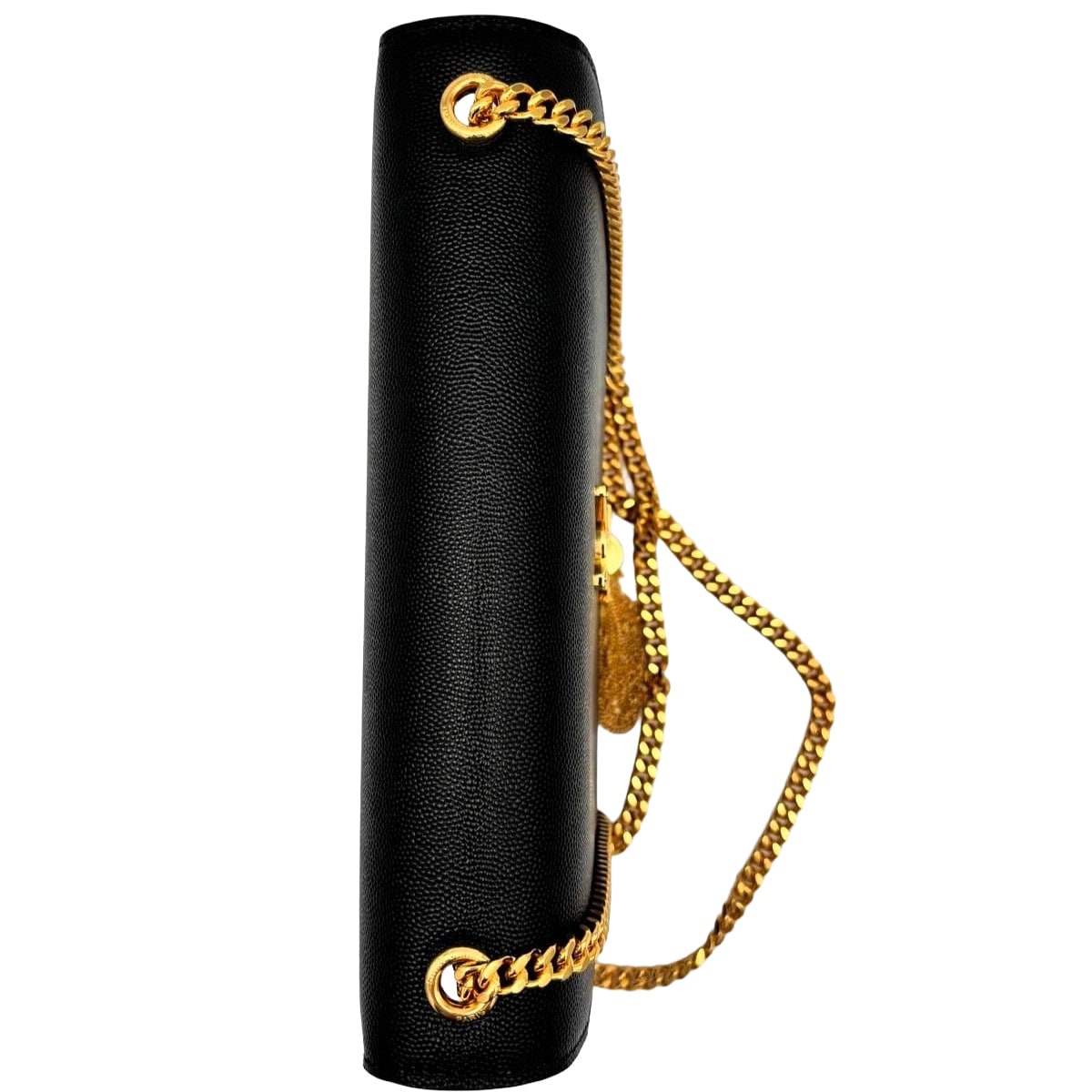 The Medium Kate Tassel bag in black grain de poudre leather captures the bold sophistication of Saint Laurent’s signature evening line. Its structured silhouette, chevron texture, and gleaming Cassandre plaque with chain tassel evoke timeless glamour and enduring elegance.