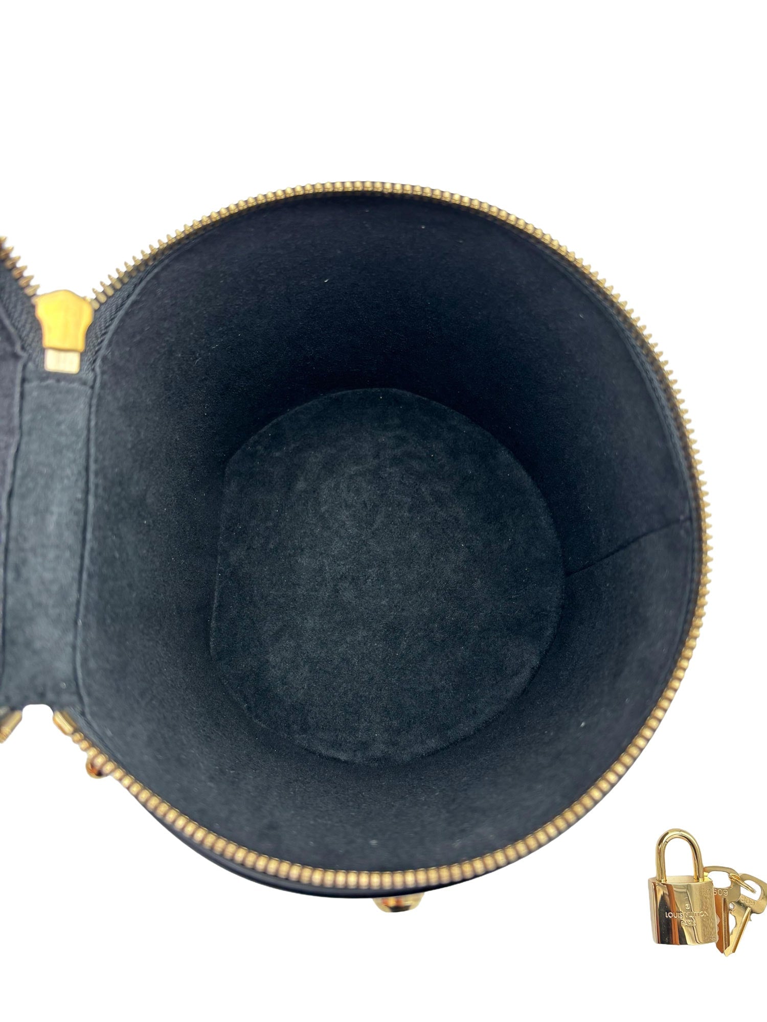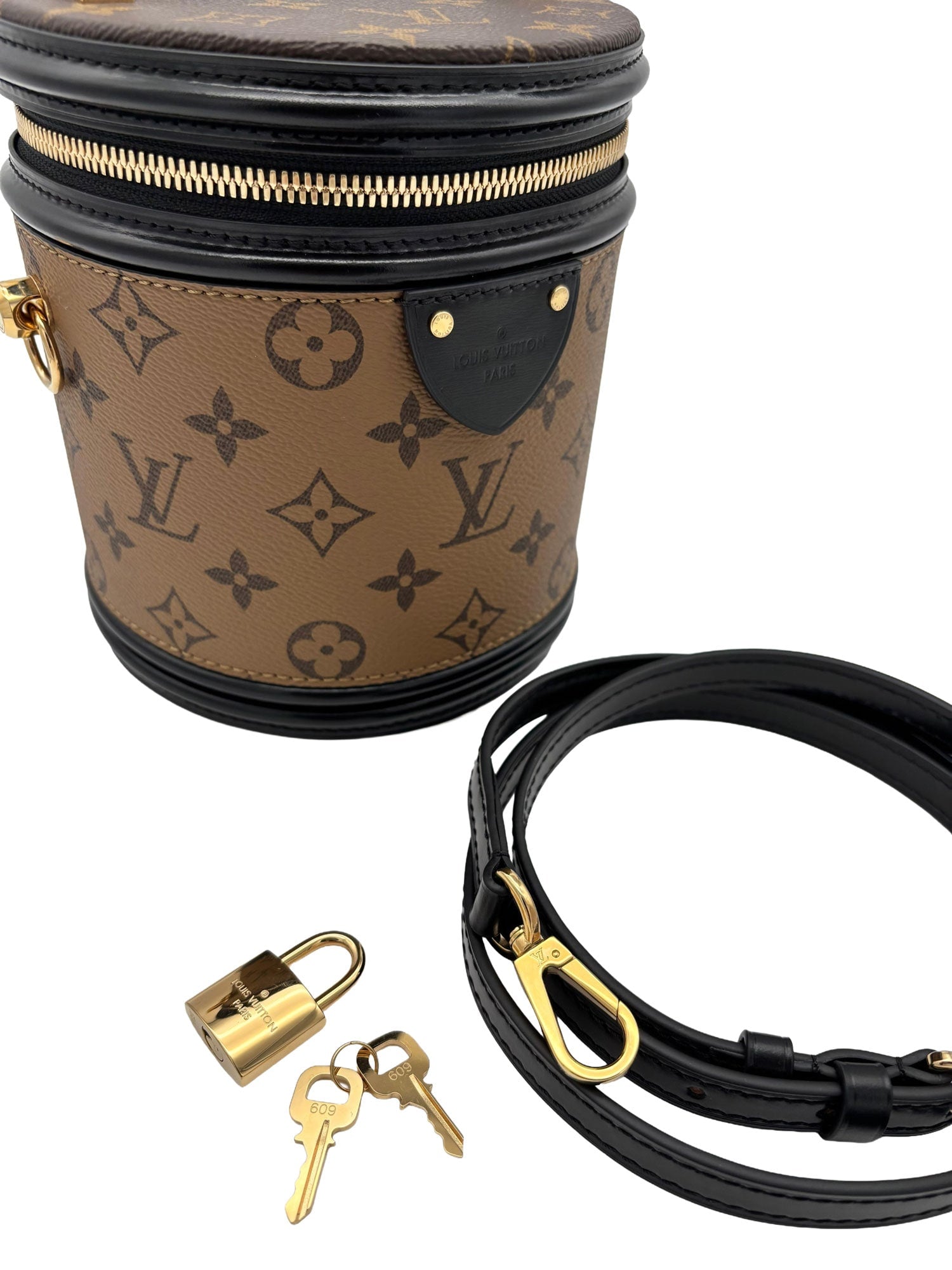- Exterior: Monogram and Monogram reverse coated canvas, cylindrical body with double-zip closure and single top handle