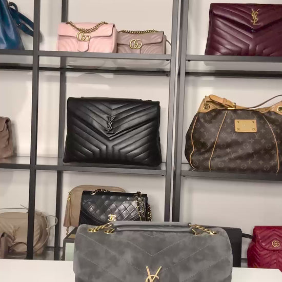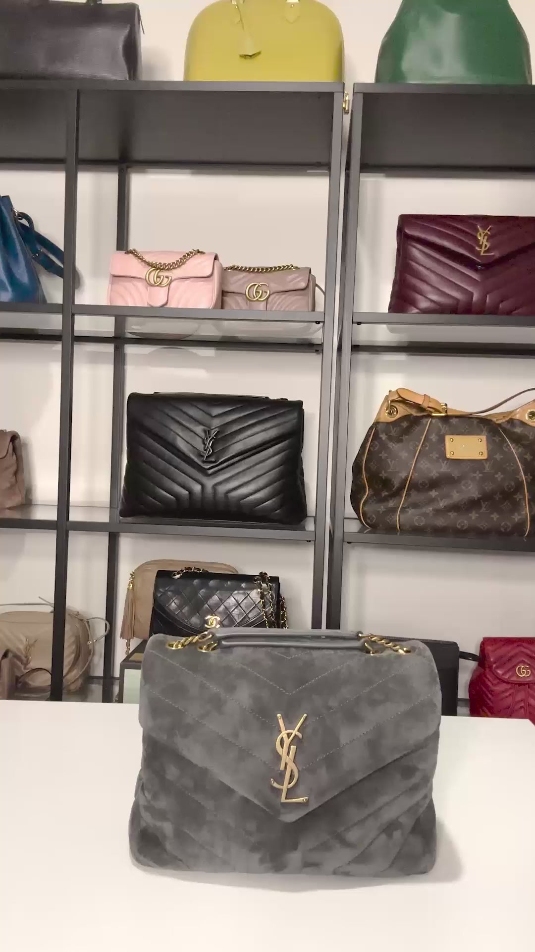 Velvety suede in a muted storm sets the tone for effortless sophistication. The quilted texture catches the light with every movement. While the YSL antique gold logo delivers a hit of heritage glamour without overpowering the look.