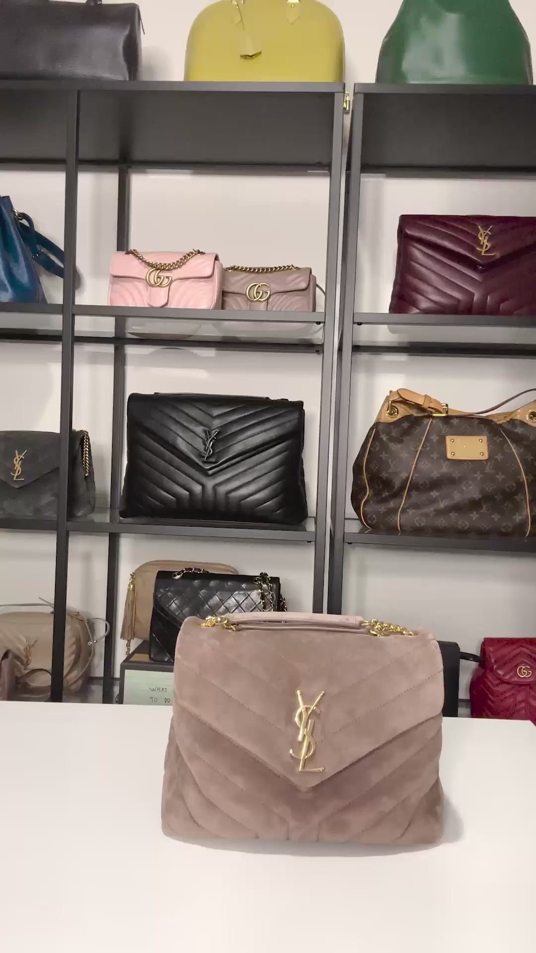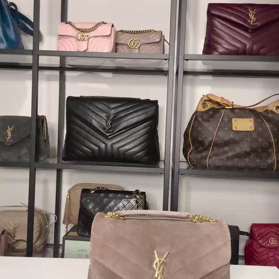 Velvety suede in a muted taupe sets the tone for effortless sophistication. The quilted texture catches the light with every movement. While the YSL antique gold logo delivers a hit of heritage glamour without overpowering the look.