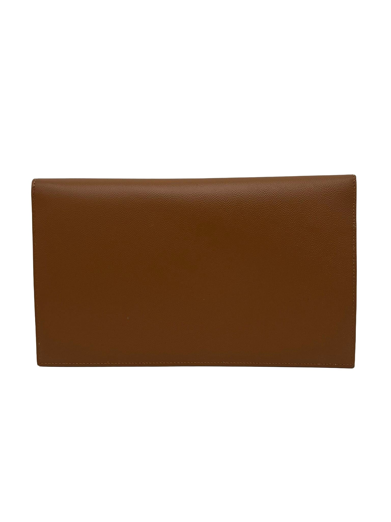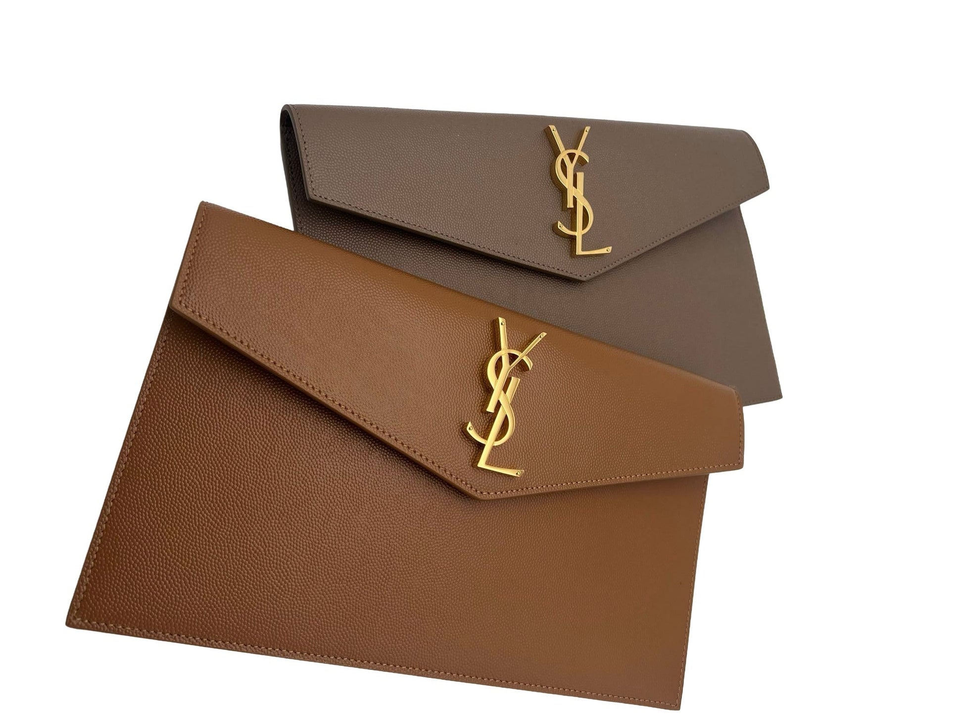 The Uptown Pouch in camel grain de poudre embossed leather is a study in minimalist sophistication. Defined by its envelope silhouette and polished Cassandre logo, it reflects Saint Laurent’s ability to merge subtle luxury with bold design.